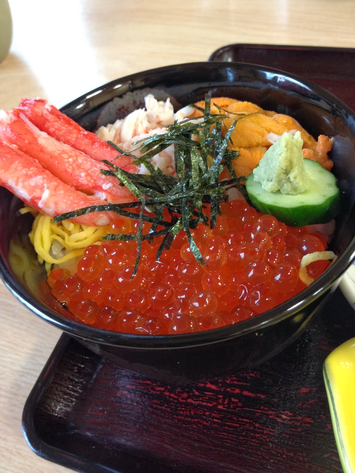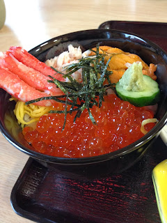 朝ご飯は、朝市のどんぶり横町にて、うに・かに・いくら丼を食す。